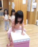 初体験の跳び箱に「なんだこれ?」と興味津々の子どもたち。ぞう組が「跳び箱だ!」と知っていて、飛び越えるものだと教えてくれました。まずは助走なしで手をついて座るところから始めました。座るのはみんなすぐに出来るようになりましたが飛び越えることへの恐怖心があるようで、とっても難しいようです。かえる跳びや馬跳びなど色々な遊びからチャレンジしていき恐怖心をなくしていこうと思います