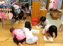お絵かきコーナーでは、5歳児の子が描いているお姫様を、4歳児の子が「かいて~」と言い、「いいよー」と描いてあげる姿があり、4歳児の子はまた3歳児の子に描いてあげている、なんて様子もとても微笑ましいです。