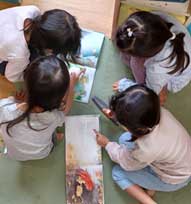 保母に絵本を読んでもらうことが大好きな子どもたち。幼児組では毎日お昼寝の前に「読み聞かせ」の時間があります。