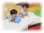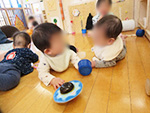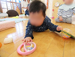 ウォーターマットが好きなのはKMちゃん。手で触ったり、顔をバウンドさせてみたりと感触を楽しんでいますよ。YTくんはキーハウスが大好きです。鍵をかちゃかちゃ指先を動かしていじっています。鍵が開き、ドアがひらくと「あー!」と嬉しそう。YKちゃんはいろんなお友だちと『どうぞ』『ちょうだい』のやりとりを楽しんでいますよ。玩具はチェーンだったり、重ねカップだったり様々ですが、相手に合わせて何が欲しいかなと考えて渡しているようです。IBくんは、床にくっついた吸盤のおもちゃをぺりぺりぺりっと剥がすのが得意です。大人がくっつけるのを見るとやってきて、上手にはがせると嬉しそうです♪