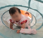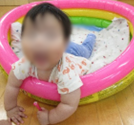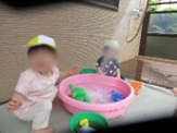 部屋にビニールプールも出しました。ぐっと上半身を支えられるようになったKちゃんは自分で乗り越えて中に入れるようになりました。中に入って休息タイム♪