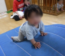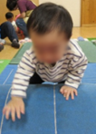 MKくんはずり這いでたくさん進めるようになりました。マット山もぐんぐん登っています。TKくんも部屋のマット山よりも少し大きな山に挑戦!上半身も、下半身にもぐっと力を入れてよじ登っています。
