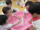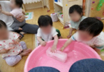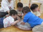 沐浴や水遊びを順番にしている間、または気温が高くテラスに出られない日に室内で氷遊びをしました。好奇心旺盛なYTくんが氷に近づいていくと、KNちゃん、TKくん、IBくん、KRちゃんが続き、氷に手を伸ばします。TKくんは、冷たくて手を引っ込めますが再び挑戦…不思議な表情で保育者を見ています。何を思ったのでしょうね。IBくんは氷をぺしぺし叩いてみたり押してみたり。いつもは慎重な姿を見せるIBくんですが、氷への興味が勝り触ってみたようです。冷たい氷にびっくりして手をひっこめたKNちゃんは、保育者が氷をクルクル回して見せると喜び、声をあげて再び手を伸ばしていました。NAくん、YTくん、KRちゃんも楽しそうな声を聞いて手を伸ばします。友だちが楽しそうにしている姿は良い刺激となり“やってみよう”と思えるようです。