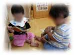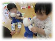 再現遊びが特に大好きなKMちゃんはビーズ棒とカップを両手に持ち、真剣な表情で、ぐるぐるまぜまぜ…しています。一方IBくんは、チェーンをカップから別のカップに移し替えています。食事のシーンの再現でしょうか。「どうぞ、あ~む!」とビーズ棒をスプーンに見立て、目の前に差し出すと、二人ともとっても嬉しそうに笑って大きな口で、食べる真似をしてくれます。