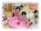 気温や暑さ指数を見て、今日は水遊びができる!という日は早めに準備し、午前寝が必要な子は眠ってから水遊びを東側テラスで開始しました。テラスに出て、タライの中の水や遊具を見ると、NAくん、YTくん、MKくんは、ここはどこ?と慣れない場所に緊張したような表情になってしまいました。保育者が水をパシャパシャしてみたり、ゾウのジョウロで水を出してみると、次第に表情が柔らかくなり遊具に手を伸ばしています。NAくんとMKくんはカップの水をごくごくのんでしまいそう!保育者が飲むまねっこをして見せるとそれを真似ています。YKちゃんはそっとタライの中の水に手を伸ばします。水の中に手が入るとうれしそうににっこり笑って保育者を見ます。KNちゃんは三回目くらいで水遊びは怖くない、と分かった様子。身体にシャワーをかけ、顔に水がかかってもへっちゃらになりましたよ。HKちゃんは初日から、楽しそう!という感じてタライに手を伸ばしパシャパシャ水をさわっているので驚きました。たくましいですね。室内にウォーターマットを常設すると、気が付いた子から続々と集まり、KRちゃん、HRちゃんが気に入り、一人になるとマットの中に寝転がって気持ちよさそうに休息していましたよ。