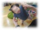 KNちゃんは、大人に「どうぞ」するのが好きです。子どもたちが差し出してくれた食べ物やスプーン(に見立てたビーズ棒)に、「ぱく!もぐもぐ…」と食べる真似をすると、嬉しくなってたくさん食べさせてくれるので、大人のお腹はいつもいっぱいです!