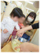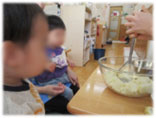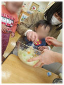 空腹を感じ何でも食べていた時代から〝これが食べたいの〟“これだけ食べたいの”と主張する姿が多く見られるようになり、ポテトサラダを作るところを見てもらう〝ルッキング〟を体験したりと、保育の中でいろいろな食材に慣れ親しめるよう工夫してきました。TMくんは食べたくない野菜はベーつと口から出していましたが、保育士が見守っていると急に野菜を食べ始めました。保育士に言われて、ではなく自分の意思とタイミングで食べられ、とってもうれしそうでした。MZくんとNAくんは好きな物と一緒なら少し苦手でも食べられるよ、とばかりに手振り身振りで主張します。2人とも大好きな人参となら「うん」と頷き、納得して食べられ完食です。IBくんは好きな物をどんどん食べたくて、おしまいにしたくない!と主張します。けれど急に気持ちを切り替えエプロンを自分で外して〝おしまい〟にし、そんな自分を拍手して認めていますよ。〝おしまい〟のタイミングを自分で決められて嬉しそうです。