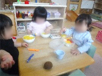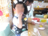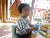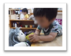 毎日の水遊び後の着替えで、“じぶんでズボンはく!”と一生懸命足を通そうとしているのは、HKくん、YUくんです。ベンチに座って、真剣な表情です。同じ穴に足を通して、マーメイド状態に…“あれ?”と首をかしげています。大人が少し手伝うと、にっこり満足で最後ズボンをぎゅっと上げますよ。MKちゃんやSRちゃんは、じぶんでの次は「やってあげたい」の気持ちが強くなっています。お人形の洋服を、脱がせたり、着せたり…友だちの帽子もかぶせてくれます。優しいお姉さんたちです♪。RNちゃんは、食事に移動する時、“じぶんでいく!”と意気込んでいます。自分で食事の場所まで移動して、自分で手を洗います。うっかり大人が今までの癖で手を出しかけると、“じぶんで!”とお断り。頼もしいです!ISくんは、だいすきな電車をブロックで作ろうとしています。ブロック同士をくっつけたいのですが、“できない!”と大人に助けを求め、一緒にブロック同士を合わせます。最後のくっつけるところは、“じぶんで”。電車が完成すると、「できたあ~」と笑顔です。