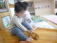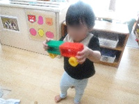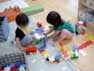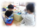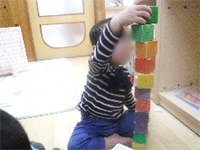 まだまだ自分でブロックを組み合わせるのが難しく、大人に「やって」とお願いする子も多いのですが、「一緒にやってみよう」と大人が一度見本を見せてやってみると、真似して一生懸命自分で組み合わせられるようになってきています。