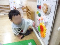 Bブロックというおもちゃでは壁面ボードに向かってブロックをはめ込んだり、どんどんブロックを繋げて夢中で遊び込んでいます。