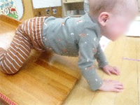 マットの下にウレタン積み木やビーズクッションを入れマット山を作って、よじ登る動きを取り入れています。登って下りて、を繰り返すのはSMくん。YUくん、はマット山の上でバランスを取りながら立つことできるようになってきて、みてみてーと嬉しそう。TIちゃんは、マットからマットへジャンプを繰り返し楽しみます。