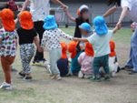 都市大芝生では、後からうさぎ組がやってくる日も。うさぎ組にまじって手を繋ぎ、輪になって『むっくりくまさん』という集団遊びで盛り上がりました!歌の最後の「にげろ~~!」で、りす組も一緒になって、走って逃げるのを楽しみます。