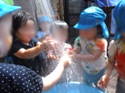 6月から始めた水遊びにも慣れてきた子どもたち。顔に水がかかるのがちょっぴり怖かった子も、楽しさがわかると水面を叩いて水しぶきを浴びながら顔にかかっても気にせず遊べるようになってきました!