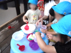RNちゃんはカップに水を入れて違う容器にこぼさず慎重に水を移し替えています。NIちゃんは水が大好きで、ペットボトルシャワーから出てくる水を浴びるように近寄って喜んでいます!スコップや手でタライの中の水をグルグルと回して水流を作り、そこにおもちゃを入れて回る様子をじっと見つめているのはRNくんです。SRちゃんはスポンジに水を付け、窓にペタッと押し当ててみるとくっつくことが分かり何度も試しています。タライで色水を作るとSRちゃんは「あか!」「(色が)かわった!」と色に気づいて楽しんでいます。TIちゃんは色水をジュースに見立てカップに入れ、大人に「どうぞ」と渡してくれます。