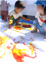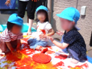 ISくんは水風船の不思議な感触が楽しいようで「ぷにぷに」と言葉で表現しています。SMくんはウォーターベッドに乗ってゴロゴロ~♪“僕も~”と隣に寝転がるのはKOくん。ニコニコと顔を見合わせながら気持ちよさそうに楽しんでいます!テラスに模造紙を広げて絵の具遊びもしました。一歩後ろでじっと様子を見ていたHKくんですが、大人や友だちがペタペタ絵の具をつけ始めると一緒に手形を付けて絵の具の感触を楽しむことができました!YUくん、MKちゃんは自分の腕や顔にも絵の具を塗ってボディペイントを楽しんでいましたよ!今後も色んな感触遊びを楽しんでいきたいと思います!
