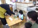 KOくん、RNちゃん、SRちゃんはそれぞれ一人ずつままごとコーナーの椅子に座り、「なにたべる~?」「パン!」「ジュースも飲む?」「かんぱーい!!」と、どんどん自分たちで遊びを広げています。友だちと楽しさを共有できる喜びを味わっている子どもたちです。