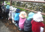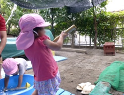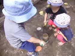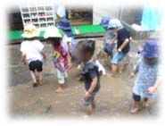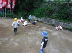 梅雨の晴れ間、子どもたちは、雨上がりの庭にある水たまりを見つけると、裸足のまま走り出します。バッシャーンと思いっきり入って、足をパシャパシャパシャ。顔まで泥が飛んでもお構いなし。そのまま泥遊びが始まります。水をシャベルですくったり、チョコレートみたいだねと、泥を集めています。お尻はぺたんと座らないように声をかけていますが、どろんこになってしまうことも多いです。晴れた日には、バケツに水を汲んで、遠くまでヨイショヨイショと、水を運んでいます。服が濡れないように、そして大事な水がこぼれないようにと真剣なまなざしで運んでいます。
