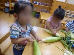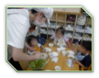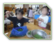 朝の時間、子どもたちが調理さんのお手伝いでグリンピースの皮むきなどを行っています。「なんか手が臭くなった(笑)」「転がっていく―」なんて言いながら、子どもたちは野菜に触れ合っています。「お昼ご飯に出るのかな?」と子ども達と話をしながらお手伝い。次の日にグリンピースが出ると「これ僕がむいたグリンピースだ!かっこいいもん」と言いながら食べていて笑ってしまいました。少し野菜に触れるだけで子ども達は「食べてみようかな」と心が動いているのがよくわかります。是非、お家でも一緒にサラダを作ってみてくださいね。