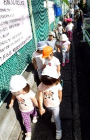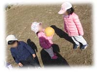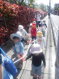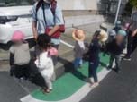 多摩川では少し遠くの広場まで足を伸ばしたり、ぽかぽか広場にも行くようになり、子どもたちも「今日はどこに行くの?」と、さんぽをとても楽しみにしています。好きな友だちと手つなぎをしていつもの道を歩いて行くと、ご近所の方に出会い「いってきまーす」と元気にあいさつをしています。工事現場では、ショベルカーに見とれて立ち止まり、まだまだ見ていたいけれども、「また帰りに見ようか!」「遊ぶ時間がなくなっちゃうね!」と、区切りを付けて再出発。学校のチャイムを聞いて、「二回なったね」「お兄ちゃんの学校も二回なるんだよ」と、友だちと話しをしたり、草花を見て「お花咲いてるね」と季節を感じています。「後ろから車が来たよ」と伝えると、端っこに寄って立ち止まり、交差点では、車が来ていないのをよく確認。急いで渡るつもりでも、アスファルトに混ざったガラスの粉がキラキラ光っていると、やっぱり心が奪われてしまいます。取れないね・・・と残念そうではあるけれど、ここは危ない所だよ!とも伝えつつ。交通ルールや危険なこと等も少しずつ覚えてきました。いっしょに手をつないでいるからこそ、頑張れることもあるけれど、いっしょに転んで喧嘩になることもありました。それでも、最後は2人でにっこり、手を出し合ってつないで歩き始めることができるみんなを、とてもステキだなと思っています。