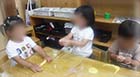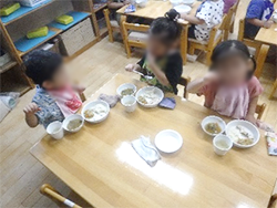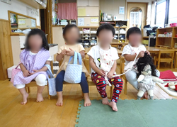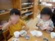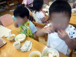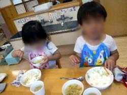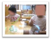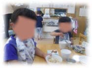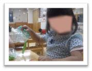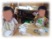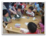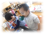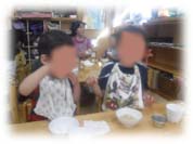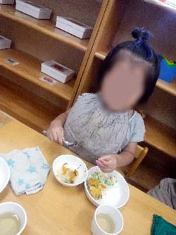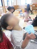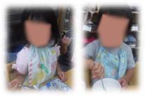 エプロンを外しておやつを食べています。「今日からエプロンないから気を付けて食べてみようね」と子どもたちに話をすると「上手に食べられた。もうお姉さんだから」と嬉しそうにしてます。お昼ご飯も「使わないでみようかな。もうこぼさないから」と意識して食べられています。