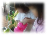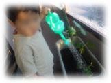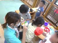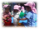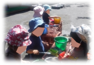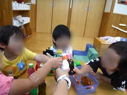 ポンプに赤、緑、黄色の色水を準備して並べます。「なにジュースにしますか?」と注文を取ってついでくれます。「全部混ぜてみよう。あ、紫になったよ。ぶどうジュースみたい」と色の変化も楽しむ子どもたちです。朝顔のお花で色水を作った時は食紅にはないキレイな色を見ることも出来ました!