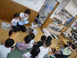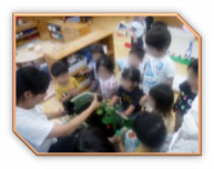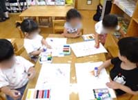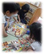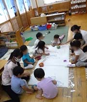 9月の交流会では、こんな楽しい子どもたちの姿を見ていただきたいと、キャタピラ作りを計画しています。いろんな画材を用意します。お父さん、お母さんも童心に返って、一緒に絵を描いたり、色を塗ってくださいね。当日は、親子共に汚れても良い格好でお願いします!