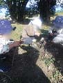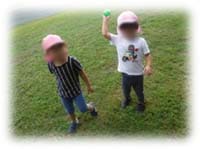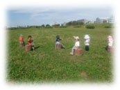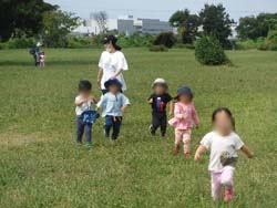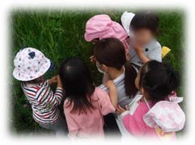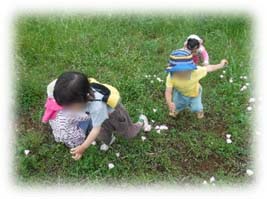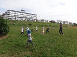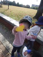 多摩川さんぽでは、土手だけでなく、少し先の遊歩道の方やぶた公園近くの広場まで出かけています。どんぐりやヒガンバナ、バッタやコオロギを見つけて、大喜びの子どもたちです。初めてバッタを見た日、○○ちゃんと、○○ちゃんは、捕まえたくて仕方がありません。でも、予想外に動きは早く、ピョーンと跳んで逃げていくので、なかなか捕まえられなくて・・・。そこへ、ひょっこりやって来た○○くんが、手を出して、「ほら、つかまえたよ!」と、見せてくれます。ほんとは欲しかった二人ですが、仕方ないよね?すごいね!という感じで見つめていました。