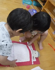 お医者さんごっこも人気です。始めの頃は、白衣と聴診器を用意して、「いらっしゃいませ~」とやっていたのですが、この頃は、「次の患者さんどうぞ~」と、声を掛けるようになっています。おなかだけでなく、背中も診てもらっていたり、大きな注射をしています。「そんなに大きな注射をするんですか?」と聞いてみると、「痛くないから大丈夫ですよ~!!」とのこと。そして、注射の後は、「これお薬です。シールもありますよ」と、再現をしています。患者役には、人形が登場することも多いです!