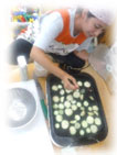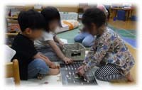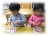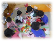 お部屋では、ごっこ遊びが盛りあがっています。中でも一番はレストランごっこ。トレーにメニュー表を乗せて、「いらっしゃいませ、何にしますか?」とお店の人。「ポテトとぶどうジュースをください。」と、お客さんが答えると、「おまちどうさま~」と、お皿に入れて持ってきてくれます。「熱いですから、気をつけてくださいね。」「ふうふうして食べてください」などと説明が付いたり・・・いろんな場面の再現が盛り込まれて、見ているこちらも思わずにっこりしてしまいます。レストラン用のエプロンや帽子も新しく用意したので、ますます盛り上がりが見られるかな?お部屋での遊びも、こっそりのぞきに来てください。参観お待ちしています!