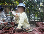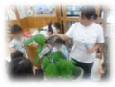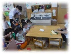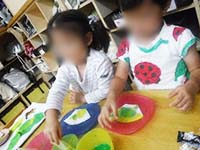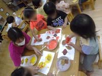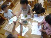 部屋では、絵の具遊びをやっています。やまとのりを加えた絵の具を使い、感触あそび。手につくとベタベタするのですが、紙につけるとすーっと伸びて色づきます。子どもたちもそれに気付いて「スーッ」と言いながら、指で描いています。途中から手に塗る方が楽しくなる子も・・・緑色に塗った手を見て、「カエルだね~」と○○ちゃん。そして、その手を本物のカエルのように動かす○○ちゃんです。じゃがいも、人参、パプリカ、小松菜などを使った野菜スタンプでは、絵の具遊びの道具とは思わず、パプリカをビリビリと破った○○くん。大人の慌てる姿を横目に残った柄と額を筆のように使って、「描けたよ~!」と、ご満悦。子どもの柔らかな発想であそびもどんどん展開していきますね。