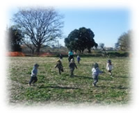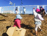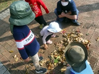 支援学校では、授業がない時間にご厚意で校庭を使わせていただいています。広くてフワフワで気持ちがいい!子ども達が落ち葉をいっぱいかき集め、葉っぱのシャワーを楽しみます。靴で踏むとザクザクいうのが楽しいようです。