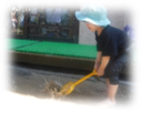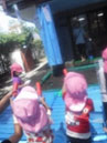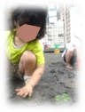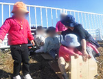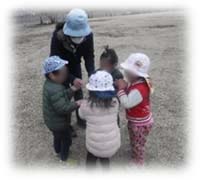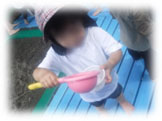 庭でも、幼児さんと一緒に遊ぶ姿が増えてきました。一緒に「あぶくたった」や「はないちもんめ」をしたり、砂場で山作りをしたり。幼児の子ども達からも、「足洗ってあげようか?」等と声をかけてくれる事もあり、少しずつ関係が近づいているのを感じ嬉しく思っています。