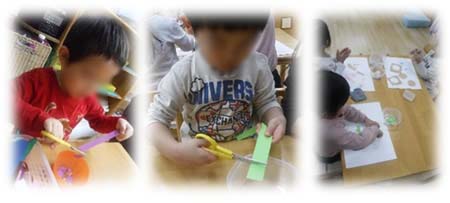 12月から、少しずつ“ハサミ”も使い始め、随分慣れてきた子どもたちです。ハサミを開いてチョッキンと切る“1回切り”で、細い画用紙を切って遊んでいます。切った色とりどりの画用紙を、のりで貼って作っただるまさんもお部屋に飾ってあるので、ご覧ください。子どもたちとハサミを使うときにはこんなことをポイントにしています。