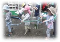 以前から時々やっていた綱引きですが、再び盛り上がりを見せています。ファミスポの時にお兄さんお姉さん、そして保護者の方々が奮闘していた姿が印象的だったのでしょう。“自分たちもあんなふうに”と憧れを持った子どもたちはすごいです。以前よりも綱を引く力が強くなり、形もさまになっています。掛け声もみんなで揃えて「オーエス!オーエス!」。勝敗も意識する子もいます。ファミスポの時のように、真ん中で審判が足で綱を踏み、「ただいまの勝負…○○チームの勝ち!」と言うと一喜一憂。次こそは頑張ろうと意気込む子や、負けたチームから勝ったチームへソソソ…と移動する子もいながら、第二回戦、三回戦と綱引きは続いていきます。
