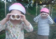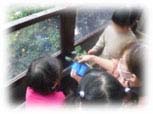みんなで庭に出て遊んでいると、雨が!「屋根の下に避難だ~!」