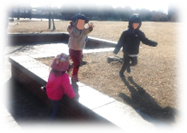 到着と同時に「しっぽちょうだい!」としっぽ取りが始まります。「ここまでおいで~」と大人を挑発するのもお手の物。子どもたちも大人に本気で追いかけられるのを待っているのがわかります。本当に早いこと。友だちと協力して追い込めるようになってきたので、大人たちの体力もそろそろ限界です。