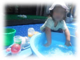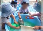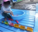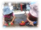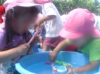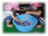普段から水遊びが大好き。タライの中にためた水を触って「つめたーい!」と満面の笑顔♪全身ビショビショになりながらダイナミックに遊ぶ子、水の感触をゆっくり楽しむ子とその子によって遊び方は様々です。