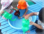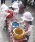 スコップですくって、コップに移し替え、そこにカラーチェーンを入れてジュース屋さんごっこ。食紅を入れて色水にすると歓声が上がります。イチゴジュースやオレンジジュースに見立てて楽しんでいますよ。大人が「暑いねー」と声をかけると「お水、つめたいよ」とじょうろに水を入れて手や足にかけてくれます。お友だちの足にもかけて、「冷たいね」「きもちいいね」と笑い合うほほえましい姿もあります。