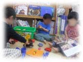 お世話コーナーは大人気。ママ、パパ、赤ちゃん、ねこ、など役割をもって子どもたちだけで遊びが広がっていきます。赤ちゃん役は沢山泣いてママパパにアピール。ミルクを飲ませて、あやして、熱が出れば病院に連れて行ってあげてと大忙しのドタバタファミリーです。