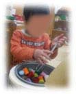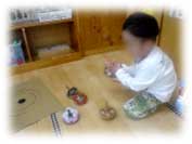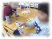 お正月あけ「こま」を出しました。「チッチーノチ!」の掛け声で、両手をすり合わせるようにして大きな手回しゴマを回します。保育者がやってみせると「え~!なに?やりたーい!」と飛びついてくる子、だまってじっとみんなの様子を見ている子・・・と反応は様々です。最近はじめた「はらぺこあおむしのメモリーカード」も、同じ様にはじめは参加せずに“見ている”子もいます。「ちょっと自信がない」「どうやってやるか分からないのは嫌だから」「取れない(勝てない)のはプライドが許さない」などその胸の内は複雑。うさぎぐみの子どもたちの心はしっかりと育っています。積極性も、じっくり観察する力も、自分を鼓舞する精神力も、こうやって仲間との遊びの中で育っていくのだなぁと、子どもたちとの毎日の中で感じます。メモリーカードは「大人が出したカードと同じ絵柄を探して取る」というルールとしては簡単なものですが、その中にも「テーブルに広げたカードは大人がカードを出すまでは取らない」とか、「最初にカードに触った人が取る」とか、「取れなくて悔しくても気持ちを切り替えないと次へ進めない」とか、色んな要素があって、どの子も少しずつルールを知ったり、自分との葛藤もしながら、新しい遊びを楽しんでいますよ!