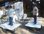 コースターでは水風船や色水を流して遊んでいます。「行った!最後まで行ったよー」と水風船を落とし、転がっていく様子や、最後まで水が流れるとクルクルと水車が回るのが楽しくて、ずーと水を流して楽しむ子どもたちです。