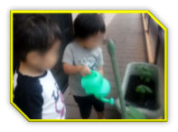 プランターに夏野菜を植えました。子どもたちに「これはナスだよ」と話をしますが苗を見せたので“ナスじゃないよね(笑)”みたいな雰囲気で始まった苗植え。「お花が咲いて、ナスができるよ」と話すと何となくわかったかな?水やりも毎日子どもたちが行います。数日たってお花が咲いているのを発見!「紫色のお花が咲いてるよ!ナスが出来るのかも」と話している子ども達です。段々と実が出来てきたら分かるかな。