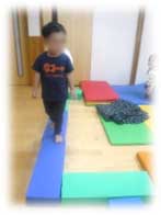 足元の橋の幅と、少し先の様子(坂道、曲り道、段差など)を視覚で捉え、体の中心線でバランスを取りながら進みます。平衡感覚が育ちます。