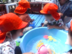 タライの水にゼリーを浮かべて、ゼリーすくいを楽しむ子もいました。光に反射して、キラキラ光っていてとてもキレイでした♪泡は、フワフワの感触と石鹼の匂いが人気!色水の上に浮かべてアイス屋さんやジュース屋さんをしたり、泡に色をつけてかき氷屋さんを楽しんだりしていました。