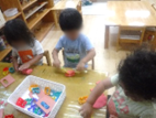 室内では、机上で粘土や製作をしたり、部屋の奥でブロックや線路、ままごとなど好きな遊びをじっくり楽しんでいます。粘土は2種類出していて、1つ目は小麦粉と米粉を混ぜて作った粘土で、2つ目は油粘土です。1つ目の粘土は、食紅で色をつけて楽しんでいて、色は毎回子どもたちと相談しながら決めています。