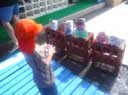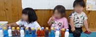 色水も作って、ジュース屋さんが盛り上がっていますよ。透明カップに入れるとキラキラ光ってとってもきれい~!テーブルや椅子の上にカップを並べ、色を混ぜて、変化を楽しんでいます。