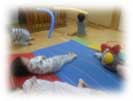 「いもむしごろごろ」などわらべうたを歌うとマット山の上を上手に転がる子どもたち。