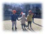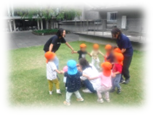 集団遊びには「隣の人と手をつなぐ」「オニと逃げる人がいる」「歌が終わってから走る」「歌に合わせて回る」などなど、ルールがたくさんあります。ルールに合わせて遊ばないと楽しく遊べなかったり、遊び自体が成立しないこともあり、なかなか高度な遊びです。すぐに上手くはいきませんが、まずは“友だちと繋がる”“一緒に遊ぶ楽しさ”を感じながら、繰り返し遊ぶ中で“協調性”“自己コントロール”などが育っていきます。身体面でも、他の人と歩調を合わせて転ばないようにまわったり、相手が痛くないように手を握ったり、動きながら声を出して掛け合いしたり・・・集団遊びの中には「育ち」が沢山散りばめられています。「はないちもんめ」も、「あぶくたった」も、うさぎぐみだけでは掛け合いやルールが難しいのですが、庭で幼児の子達と一緒に遊ぶと「おみそ」対応もしてもらいながら経験を積みかさねられていて、幼児の子達も「うさぎぐみだからこうしてあげよう…」と考えながら遊んでくれて、皆で育ちあっているなぁと感じるのです。「だるまさんがころんだ」「あみなげた」「ひっこしオニ」などこれからも楽しみな集団遊びがいっぱい。保護者の皆さんも、子どもの頃遊んだ記憶があるのでは?保育園の子ども達にこんなのどう?と提案もお待ちしております!