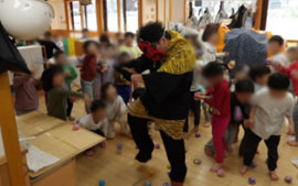 年長児のぞう組が各クラスを回り「鬼は外、福は内」の声と共に、季節の行事を楽しみました。ちょっと怖くて泣いてしまう子も、鬼の正体がぞう組のおにいさんお姉さんだと分かると保育者の傍らに寄り添いつつも安心した様子でした。