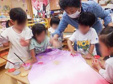 毎年幼児クラスのぞう組(年長児)を中心に鯉のぼりを作ります。染める色を決め、染め、幼児クラスのみんなの手形(鱗のイメージ)を押していきます。今年も素敵な鯉のぼりが完成しました!ぜひ見に来てくださいね。